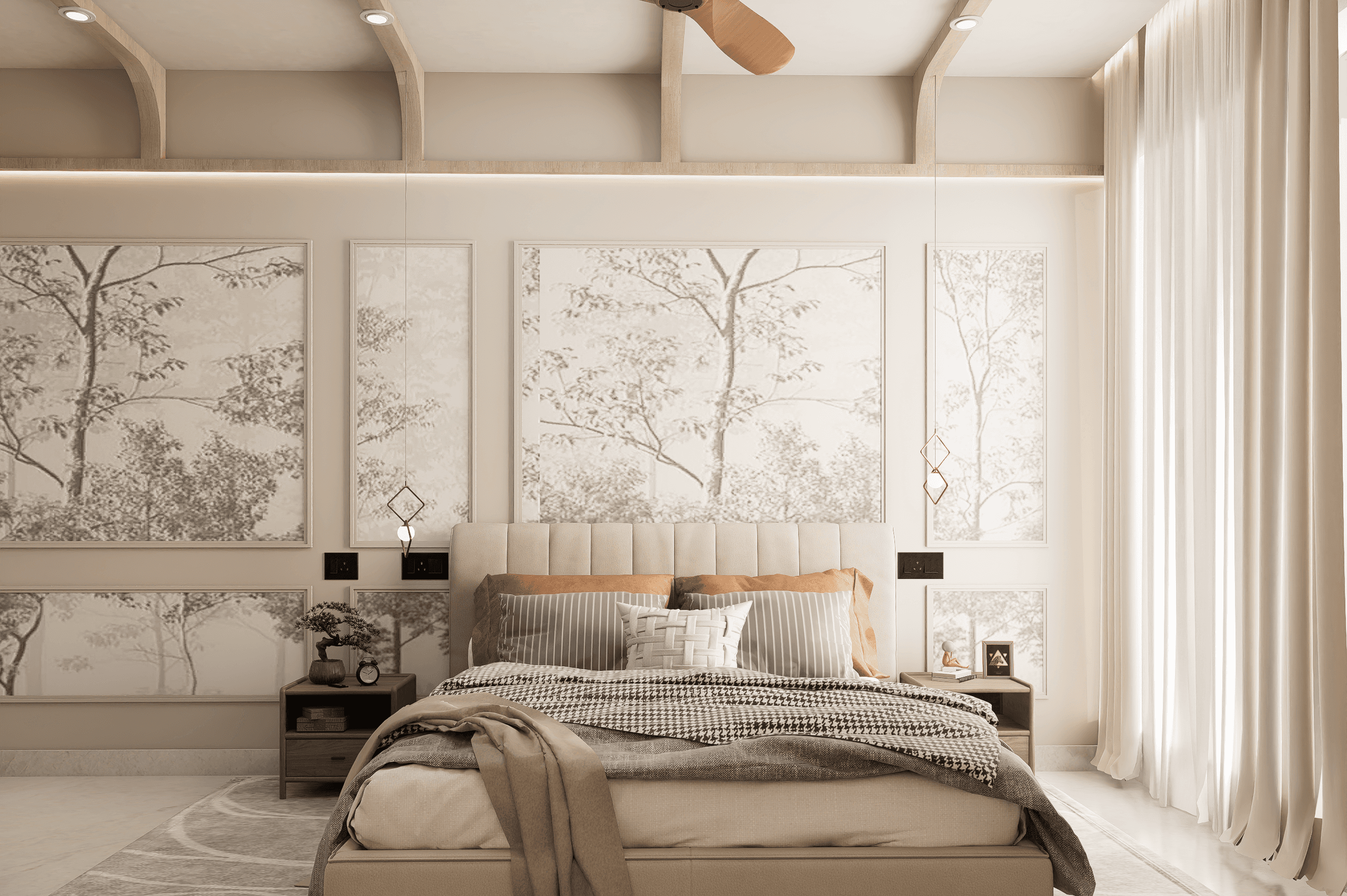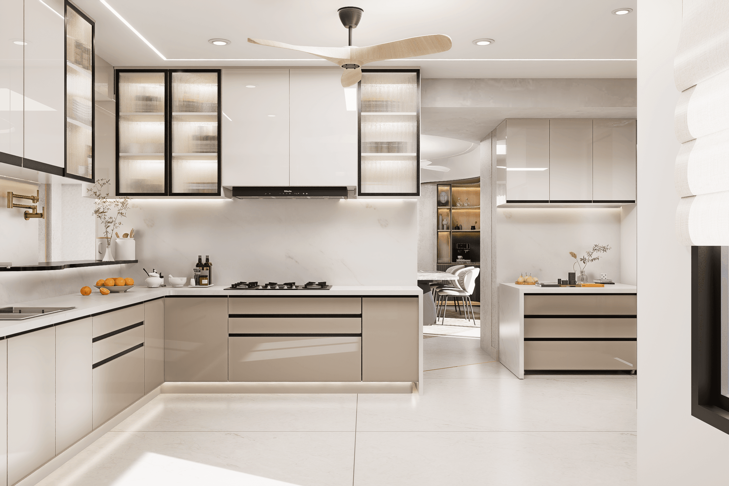The studio engaged with the project at an early stage, when the floor plate existed as a bare shell, free of internal walls. This allowed the spatial organization to emerge from first principles rather than constraints. Instead of rigid partitions, the design introduces a series of nodes and axes, seamlessly connected through subtle curves and fluid transitions. These gentle geometries soften the linearity of the plan, creating a continuous and cohesive spatial experience. This project stands as a unique exploration for Studio Fingo, an apartment formed by merging two 4-bedroom units in JP Nagar. The resulting footprint stretches into a linear plan of approximately 100 feet by 35 feet, offering both a challenge and an opportunity to rethink continuity within a residential setting. The planning is guided by orientation and the rhythms of the day. Living spaces are positioned along the eastern edge to welcome the morning light and energy. The dining and kitchen follow as transitional zones, while the bedrooms shift toward the west, offering a quieter, more introspective environment as the day winds down. Despite its openness, the home maintains a careful balance between connectivity and privacy. Cross ventilation, ample natural light, and minimized internal barriers contribute to a sense of clarity and calm. The result is a living environment that feels expansive yet intimate, an uninterrupted spatial narrative shaped by light, movement, and material continuity. A restrained palette of beige, crème, and browns forms the base, punctuated by accents of terracotta, teal, and peach. This interplay of tones unifies the home while lending moments of warmth and character across the length of the space. Flooring plays a key role in reinforcing movement and continuity. Marble inlays trace oblique geometric curves across the floor, subtly guiding circulation while enhancing the sense of flow. These patterns echo the language of the ceilings, where soft curves and refined finishes further dissolve boundaries between spaces.